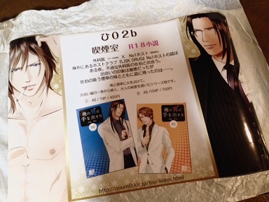 2016/10/03 Category : オフ活動・イベント等 有難うございました アフターレポートのような物。無事にJ庭終了しました♪とにかく暑くて汗が;扇子で扇ぎつつ過ごしましたがとても楽しかったです。思っていたよりずっと沢山の方にスペースに来て頂き、サイトに遊びにいらして下さっているという方ともお話しすることが出来て感激しました。足を運んで下さった方、本当に有難うございました♪手にとって下さった方が、少しでも気に入って頂けたら嬉しいなと思います。本当はお一人ずつ抱きしめたかったのですが、怪しいので我慢しました(笑)それにしても、物凄い活気のあるイベントですね。あんなに沢山の人混みの中に久々に入ったという感じでした。二次でのオンリーイベしかサークル参加した事がなかったので、規模の大きい一次イベがどういったものなのか知らず、9時半会場ってあるけど、10時前に着いていればいいよね?とか思って、8時に起きて準備をしながらtwitterを覗くと……。「もう並んでる~」等の驚きの呟きが……。私は車で行ったのですが、めっちゃ慌てて高速へ飛び乗りました///まぁ、でも結果全然間に合ったんですけどね^^;急いだ分余計に暑いという(自業自得)次回のJ庭(予定は未定)の時には直したいなと思う反省点がいくつか……。忘れないように書いておこうかな。・イベント直接搬入の前に色見本を提出して確認する。これをしないで本番ぶっつけで出来上がった同人誌を見たら、肌色がとても濃い^^;見た瞬間「あれ@@」となりました。多分気にしない人は全然気付かないとは思うのですが、怒濤のオレンジ色;印刷会社の方がご挨拶にきた時に、「何か気になる点はありますか?」と聞かれたので「肌色が濃いです;」とお伝えしました。次回こそは……。・差し入れを持っていかなかった。これね……。ポストカードやチラシ、その他に気を取られて、そんなにまわらないしいいかなと用意しなかったのですが、サークルの方からも差し入れを頂いてしまい、もうもうほんっとお返しがなくてすみません状態でした;ひたすら後悔;次回こそ(ry・ポスターを貼る場所がおかしかった。あれ……。スペースの背中当たりにババーンと皆さん掲げていらっしゃるのね……。私のサークルはそんな棒も持参しておらず、机の下に……。目立たない事この上ない。次回は棒買って行きます。・頂いた差し入れを帰宅してすぐに食べてしまった。これは、ほんと何も考えていませんでした;他のサークルさんのレポートを見ると、頂いた差し入れは「有難う」の意味を込めて写真を綺麗にとって、「嬉しかったです」的な事を書いていらっしゃったようなのですが……。私、嬉しくて帰宅したらすぐに色々食べてしまったのです(お昼抜きだったのでお腹がすきまして(言い訳)気付いたら写真を撮れるような状態ではなく;クッキーやチョコレート、可愛いハロウィンにちなんだお洒落なスイーツ、ご当地のお菓子、素敵過ぎて使うのがもったいないリップとハンドクリームのセットとか、もうもう、本当に嬉しかったです。どれもとーーーっても美味しくて、一気に疲労度回復しました。お肌もすべすべ^^次回こそは食べる前に写真を(ryこんな所ですかね。そして今回【A急列車】の青虫さんにもお会いできました~♪拙宅からもLINKを繋がせて頂いているのですが、J庭に参加されているのを知っていたので、是非お会いしたくてウズウズしていたのですがついに実現(喜)サイトのイメージ通りとても優しそうで素敵な雰囲気の方で、スペースまで来て下さりお名前を名乗られた時は緊張して……、今思い出すと何を最初に言ったか覚えていない程でした(ダメ)で、でもその後、気を静めて再チャレンジで青虫さんのスペースへおうかがいして、欲しかった新刊含む全部の種類をゲットさせて頂きました^^次回はもっと挙動不審にならぬようにしたいと思いますw青虫さんもそうですが、10年程前から存じ上げていて、今になってご対面というのはなんというか……とても感慨深い物があります。ずっとずっとお会いしたかったMさんにもお会いできて、ちょっと感動して頭が真っ白に(笑)お会いしたい方沢山いるのですが、北海道だったりー、九州だったりー、大阪だったりー、と中々会う機会もないので尚更会えるという事が貴重な気がしてなりません。結局15時までのイベントで15時近くまでいたのですが、あっという間だったな~。本が出来るまでは色々と大変ですが、出来ちゃうとまた次を作りたくなりますね。だがしかし……【俺の男に手を出すな3】を同人誌にする場合、エロもなくて長いという、どこのくくりに申請すればいいのか。悩み所ですね(苦笑)まぁ、それはまた考えれば良いのかな……。J庭アフターレポートは以上です。最後に一枚だけ撮影した参加記念を貼っておきます♪(ポスター丸まってるし、水筒写ってるしもう、ね;) 今日からはまた通常運転です。まったり更新ですが、これからもどうぞ宜しくお願いし