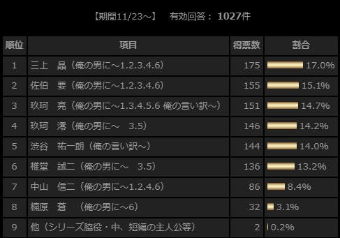 投票では毎回力を発揮する玖珂兄弟や椎堂など、変わらず応援して貰えて幸せです。